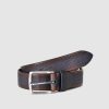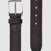 Cinturón en 38 mm de piel de vacuno en color. Grabado con tintas inocuas untadas manualmente para conseguir unos tonos difuminados azules. BELLIDO grabado a fuego en el pasador. Hebilla en acabado níquel negro satinado.